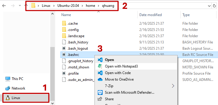 .bashrcfile in the user’s home directory, e.g. using Windows File Explorer:Linux/Ubuntu-20.04/home/user/.bashrcand open the file using any text editor app e.g. Notepad 3