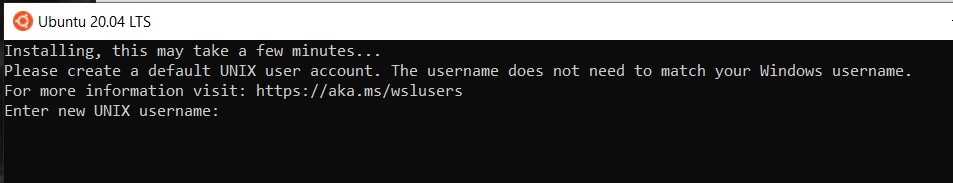 Ubuntu 20.04 LTS, you will see the following console. Please set up your WSL, also see Set up a WSL development environment