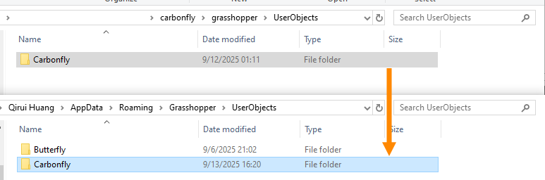 %AppData%\McNeel\Rhinoceros\8.0\scripts\carbonflyand copy in the newcarbonflyfolder. - Delete%AppData%\Grasshopper\UserObjects\Carbonflyand copy in the newCarbonflyfolder fromgrasshopper/UserObjects.